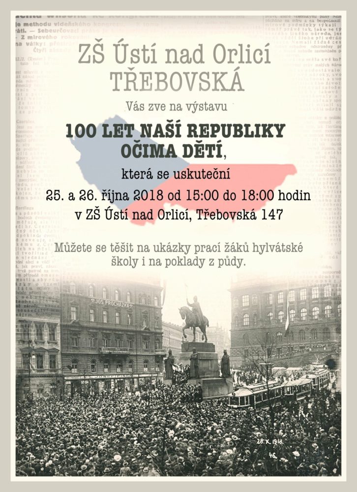 Základní škola Ústí nad Orlicí Třebovská Vás všechny srdečně zve na výstavu „100 let naší republiky očima dětí“, která proběhne ve dnech 25. a 26. října 2018 od 15:00 do 18:00 hodin v prostorách školy. Můžete se těšit na ukázky prací žáků hylvátské školy i na poklady z půdy. Přijďte se s námi ohlédnout za […]