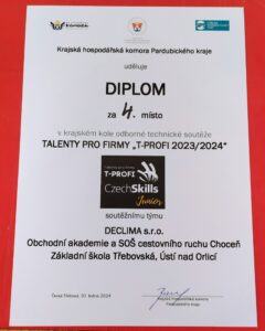 Tři naši žáci 5. třídy se zúčastnili krajského kola odborné technické soutěže TALENTY PRO FIRMY „T-PROFI 2023/2024“. Spolu se třemi studenty 2. ročníku Obchodní akademie a SOŠ cestovního ruchu Choceň vytvořili pod odborným vedením firmy DECLIMA s.r.o. společně jeden tým, který splněním soutěžního úkolu obsadil krásné 4 místo, gratulujeme!